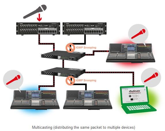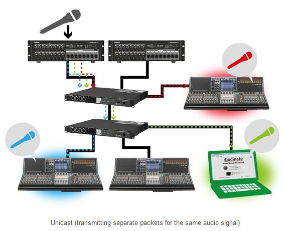 In unicast, packets (audio signals) are duplicated for each device that the signal is sent to. You can set the routing for each of the signals separately without considering whether the signals are duplicates of each other. From the standpoint of efficient use of network bandwidth, unicast might not be ideal, but because it results in low switch loads and makes routing configuration easier, we recommend that you use it under normal circumstances.
