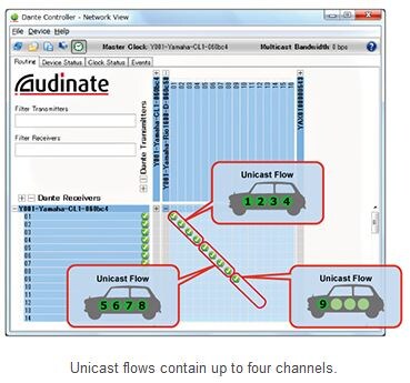 In conclusion, if there are not enough flows available for transmission, use the Dante Controller software to configure multicast, and reconfigure the network so that less flows are used. In such a case, do not use the routing functions that can be configured from specific Dante devices and software such as CL/QL series console and MTX-MRX Editor; instead, only configure the routing using Dante Controller. Be careful to keep the number of multicast flows (channels) to the minimum, because multicast flows increase the load that the switch is subjected to. Up to eight channels can be grouped into a multicast flow, further increasing their efficiency.