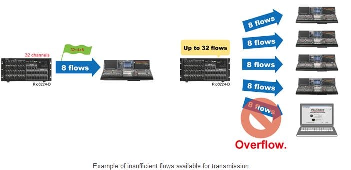 There are limits to the number of flows that can be assigned to a transmitter or receiver. For example, CL/QL Series consoles and R Series I/O racks can all send and receive 32 flows. For the Rio3224-D, which has 32 analog inputs, to send all 32 channels to a single Dante device, 32/4 = 8 flows are sufficient. However, using unicast flows to send the channels to 4 devices (CL/QL series consoles, for example) requires the use of all 8 × 4 = 32 flows.
