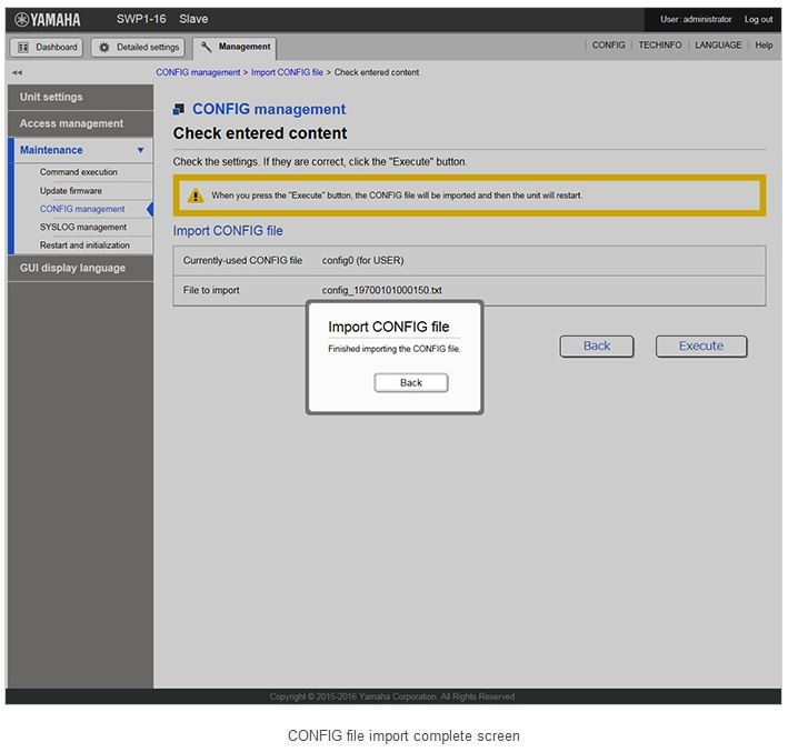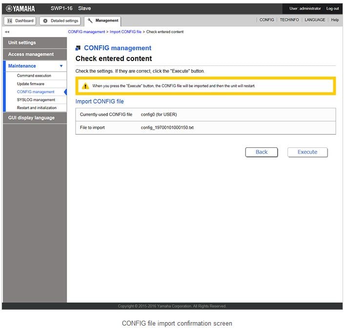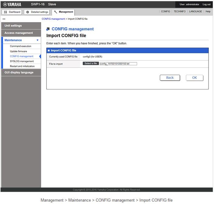 When starting the switch in DANTE mode, the settings will start in an initialized state every time, so there is no need to save or replicate the customized settings from last time. In USER mode, the switch can be booted up with customizations that have been saved, such as VLAN settings; and these settings can be replicated for use on a different SWP1 Series switch. From the standpoint of efficiency of making the settings and having a spare switch on hand, we recommend that you use the SWP1 Series for switches on the same network.