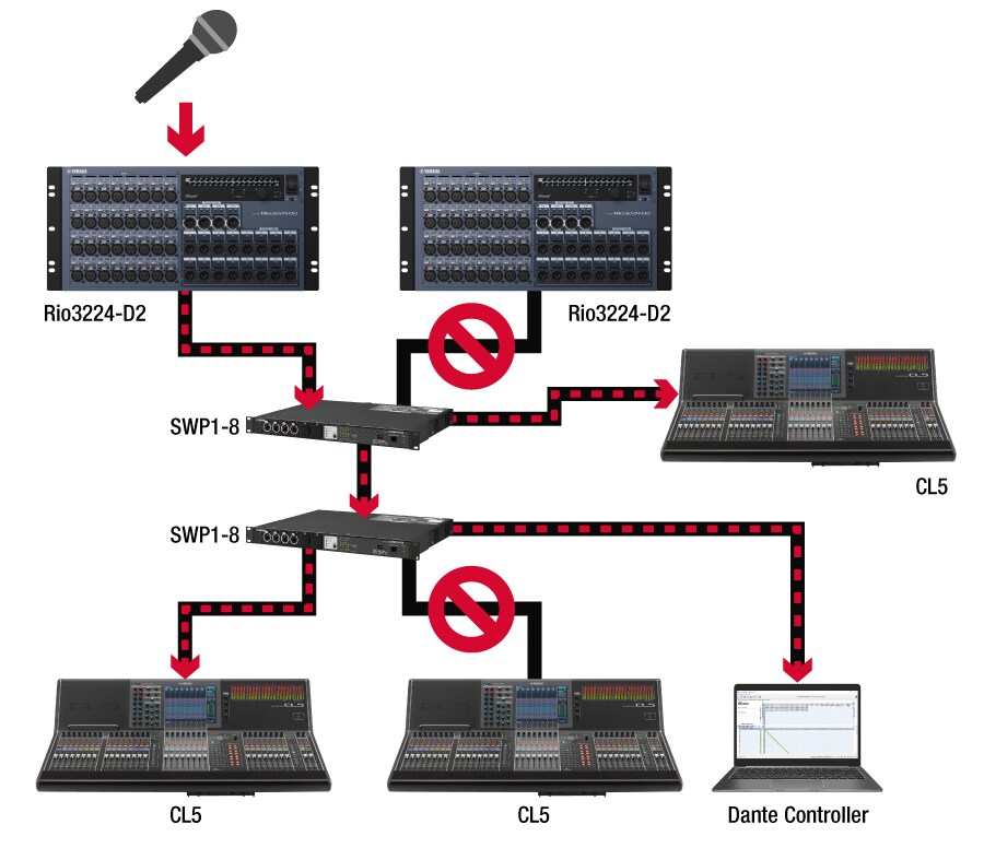 • ‑ Dante (1000base-T) bandwidth is 100 MHz so CAT5e or better cable is required.