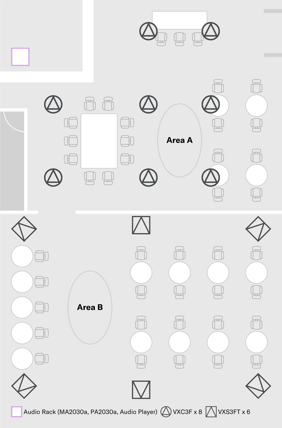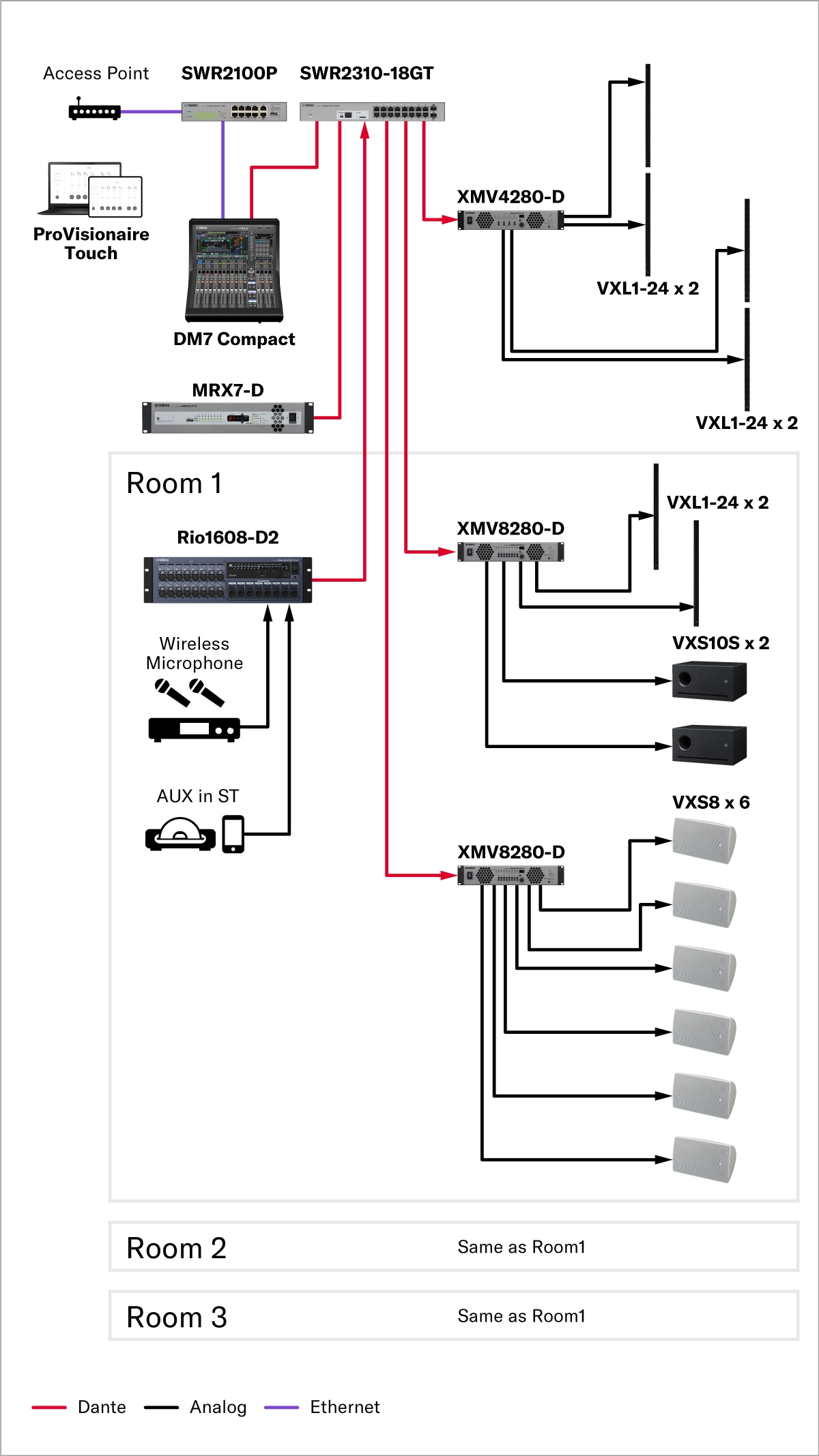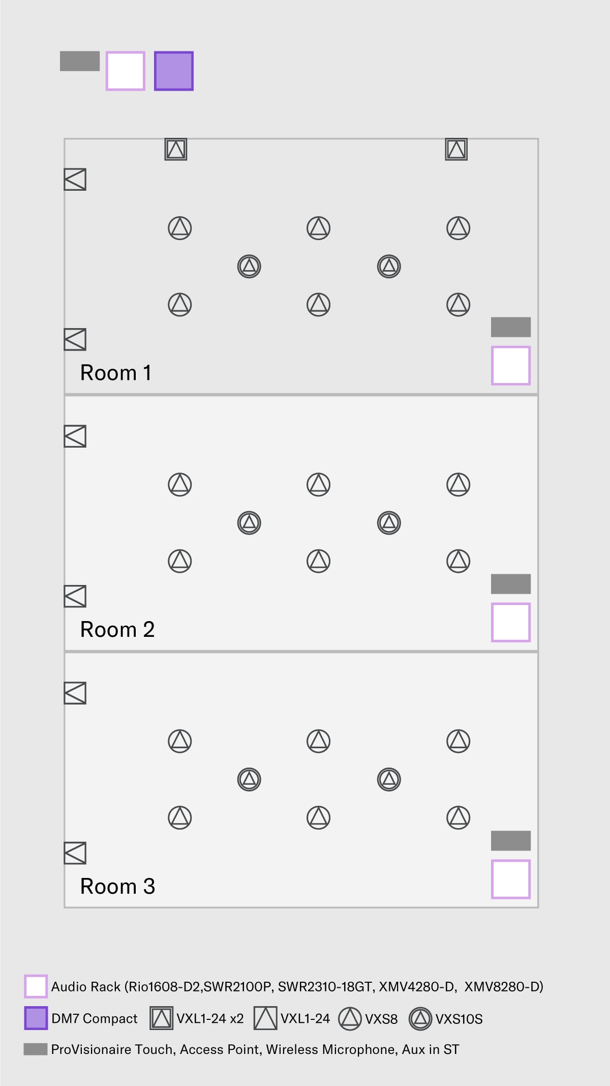 Each room in this example is equipped with a VXL1-24 slim line array speaker to reproduce two wireless microphone signals and PC audio, while VXS8s installed in the ceiling provide additional sound output and clarity. VXS10S subwoofers are also ceiling-mounted to provide ideal low-frequency performance from audio playback sources. Users can control this simple setup conveniently via the ProVisionaire Touch tablet remote control app.