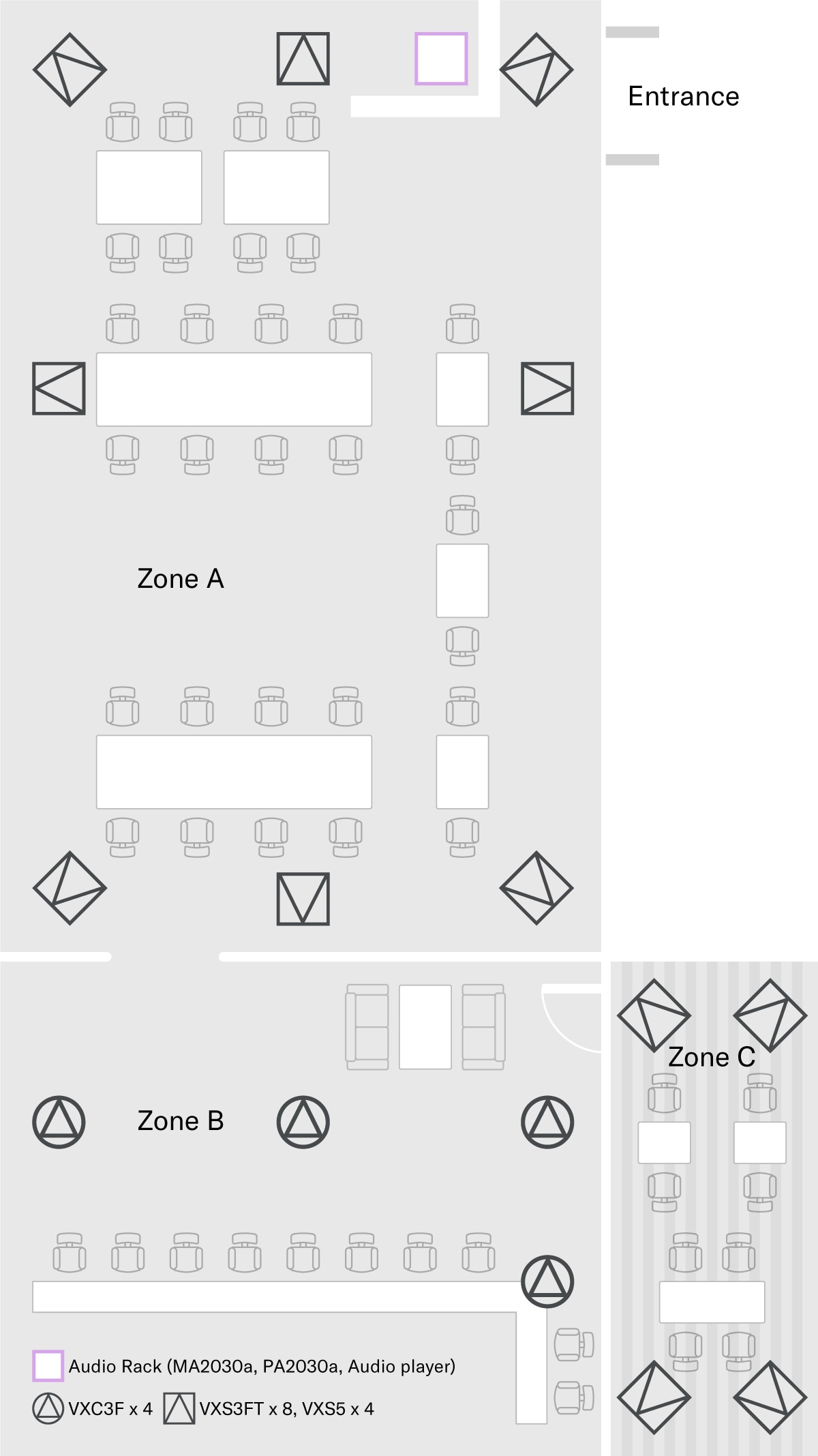 For spaces that can be divided into two zones, separate volume settings can be adjusted for each zone by disabling the volume syncing function between the MA2030a power amplifier and the PA2030a expansion amplifier. This allows customers to listen to background music at an ideal volume both in quiet environments, and spaces with more ambient noise such as a terrace.