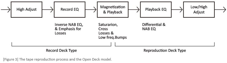 Figure 3 shows an overview of the tape reproduction process. Of course the physical phenomena involved were well understood at the time, and were taken into account in the design and manufacture of tape recording and playback equipment. To accurately emulate the process digitally it is necessary to use VCM technology to model the characteristics of the circuitry from the recording amp to the record head, the properties of the magnetic tape itself, and the circuitry from the playback head to the playback amplifier with its NAB or similar playback equalization. Numerous elements are involved, but none are particularly difficult to model individually. The analog recording and playback process shown in Figure 3 is also the block diagram of our VCM Open Deck model.