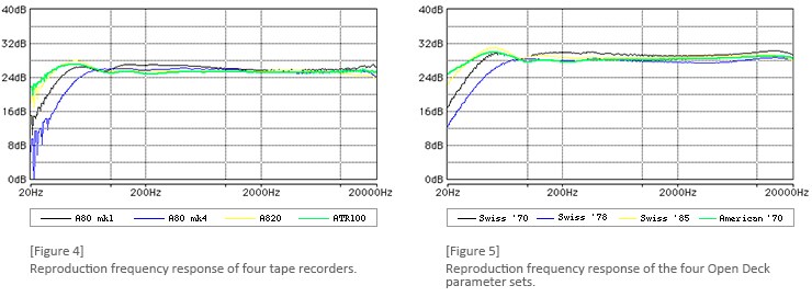 Let’s consider frequency response as an example. Figure 4 shows the actual reproduction frequency vs. amplitude response of the four analog tape recorders. Figure 5 shows the response of the corresponding VCM Open Deck models. You can see that the response is accurately recreated, right down to the finest details. Please note, however, that the Open Deck effects model a number of the nonlinearities introduced by the analog tape reproduction process, and the data shown here represents only one small part of the overall Open Deck effect.