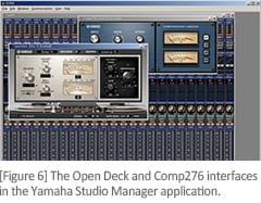 The VCM technology based “Add-on Effects” series was initially released in 2004 as audio effects for Yamaha digital mixing consoles. Other effects in the series include the Comp276 and EQ601 effects created under the direction of recording engineer Shinichi Akagawa. All are highly regarded for their outstanding musicality. Figure 6 shows the Open Deck and Comp276 interfaces in the Studio Manager application that allows overall management of Yamaha digital mixing console data.