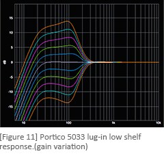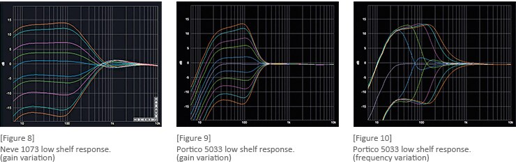 A notable characteristic of the Portico 5033 equalizer filter (transfer function) is the distinctive response of the Neve shelving filter. Figures 8, 9, and 10 show the frequency response of the low shelving filters used in the well-known Neve 1073 developed by Mr. Neve in the late ‘60s and the current Portico 5033 by RND. One of Mr. Neve’s significant achievements at the time was the effective use of overshoot at the “shoulder” of the shelving filter curve to create an optimized overall response. Rupert Neve was a pioneer in engineering this type of filter response at the time, and the same approach was used from the early 1073 through to the Focusrite ISA equalizers. The famous SSL 4000 series and other consoles were also influenced by the original Neve concept, but the current RND Portico units take the merits of that design to new heights with refined, up-to-date circuitry. In broad terms, Mr. Neve’s ideal is a trapezoidal shelf shape that can be approximated by carefully engineering the filter’s overshoot. Moreover, the overshoot changes subtly according to the filter’s frequency setting, so its affect on the sound is multi-dimensional and complex. This meticulous control of frequency response is just one aspect of Mr. Neve’s genius.