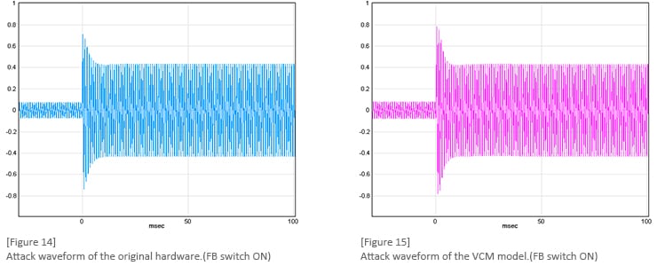 The ability to select between feedback and feed-forward compression has been accurately modeled in the VCM model. Figures 14 and 15 compare the attack waveform of the original with the VCM model. Even the very slight dip in the envelope due to over-compression when the FB switch is engaged has been precisely emulated (although it’s difficult to see in the graph). The functional models of the Portico equalizer and compressor were soon completed and presented to Mr. Neve with a direct comparison between the VCM models and the original hardware. Mr. Neve gave us his approval, and it was time to move on to the next phase: adding the distinctive sonic character of the devices.