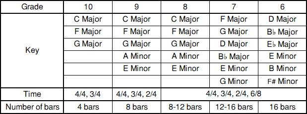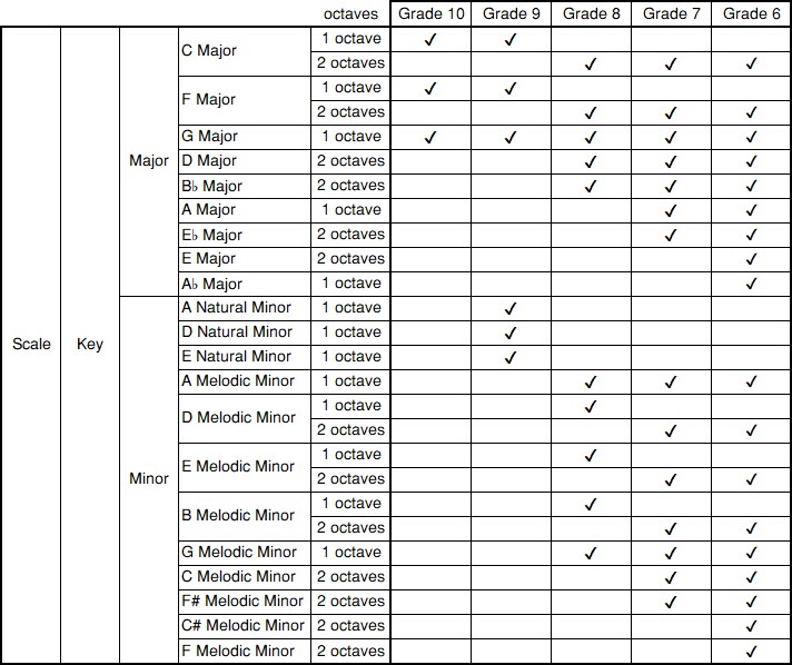 Candidates play one (Grade 10), two (Grades 9-6) scale(s) selected by the examiners without the use of a score.