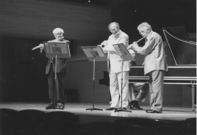 The, Louis Lot flute had a slightly lower pitch. It had a longer body and intervals between tone holes were wider than usual; therefore, the actuarial calculation showed that it was supposed to have A435 Hz. The old Haynes flute Mr. Rampal was playing also had a design which was supposed to produce slightly lower pitch (A438 Hz), but it was sold as a flute which had A440 Hz. As he kept playing those instruments, he used to say, “I have been playing these flutes for so long and now we are one in body and soul. Even if something doesn’t go well, that should be my problem, not the instruments’.” Although he also had a Haynes flute which had A442 Hz pitch, he only played it when he was playing in Vienna and other areas where the pitch standard is a bit higher, or in the case of emergency such as when he had to leave the instruments for repairing. The other unforgettable memory is that he said, “It took me eight years to make this Haynes truly mine. Nowadays those young people choose instruments which they can handle easily. However, that makes everyone sound same. The sound is something you can obtain after unflagging effort and struggle.”