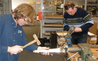 Matsukuma with Simon Gresswell. In the end I would trust my instinct. I can calculate tube bore size to some extent, but calculating its wall thickness, which I sometimes do for manufacturing purposes, isn’t very useful for sound. For example, when I have a player try several instruments, I watch their facial expression whilst listening to their sound. When I ask for the player’s opinion after the trial, I sometimes notice that the response is different from the sound produced. Also in some cases, I receive overseas player’s feedback on an instrument from our overseas staff via e-mail, which can be easy to misunderstand. To avoid such things, I go abroad as much as possible to hear the sound by myself, see the look on player’s face, and think it over myself, while hearing the views of others being there and hearing the same sound. Hearing only words definitely leads to misunderstanding. For example, when a player tests another make of instrument and says “I like this kind of sound”, if I am there to hear the sound with my ears, a drawing comes to my mind. Then my instinct starts to work for the drawing to determine the wall thickness, within 0.1mm range. Designs happen like this. They can’t be calculated.