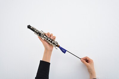 * Om te gebruiken steekt u het uiteinde van de wisser er vanaf de onderkant van de hobo in, met een draaiende beweging met de klok mee om vocht en vuil van de binnenkant van uw instrument te verwijderen.
