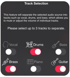De nieuwste versie van Rec'n'Share (iOS 3.3/Android 3.4) beschikt over geavanceerde AI-algoritmen voor het scheiden van audiotracks. Naast zang-, drum- en basdetectie kan de software nu koperblazers-, piano- en gitaartracks scheiden van een track met gemengde audio. Deze nieuwe functie breidt het scala aan mogelijke toepassingen uit doordat maximaal 3 tracks kunnen worden geëxtraheerd voor individuele volumeaanpassing voor opname of oefenen.