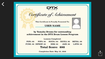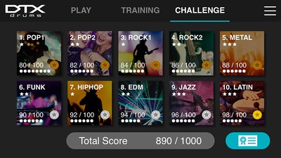 De 'Challenge Mode' is een nieuwe functie in de DTX402 Touch die uw vaardigheden test. Als u alle 10 oefensongs kunt spelen zonder een fout te maken, ontvangt u een 'Drummerscertificaat' van het Yamaha DTX-drumteam dat u kunt delen via social media.