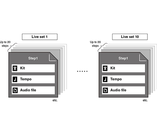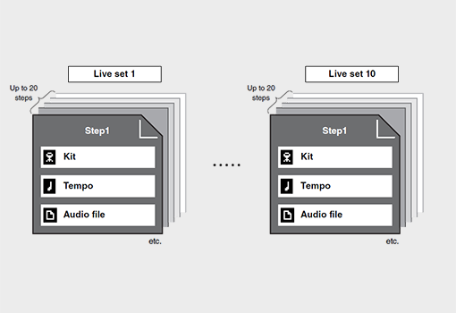 Met de nieuwe 'Live Set'-functie kunt u verschillende combinaties van kits, tempo's, audiobestanden en achtergrondtracks vrijelijk arrangeren en configureren, en deze met één enkele touch oproepen. Je kunt ook verschillende klikinstellingen maken, geschikt voor verschillende speelbehoeften.