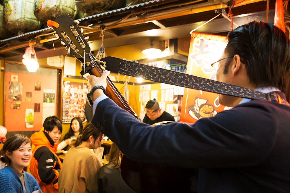 “Because the customers’ requests comes from a wide range of genres, the guitar is the only instrument that can really handle such demand,” said Nakayama. “Accordion is beautiful, but is inevitably going to be rhythmically weak. Because the guitar has a percussive aspect, you can get into the rhythm, but you can also strum quietly for a subtler performance. I love my Dynamic No. 20. The body is a smaller than a normal guitar, but it still delivers a big sound. When you're walking around in a crowded izakaya, the smaller the better, as a bigger guitar can get in the customers' way.”