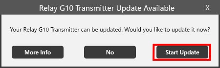 Als de oude versie van Relay G10T wordt gedetecteerd, ziet u het onderstaande venster verschijnen. Klik op de knop Start Update om uw Relay G10T te updaten.