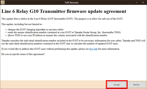 Voordat de firmware-update begint, verschijnt de onderstaande melding. Lees de Line 6 Relay G10 transmitter update agreement (Line 6 Relay G10-zenderupdateovereenkomst). Als u de overeenkomst accepteert, klikt u op 'Accept' (accepteren).