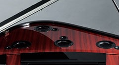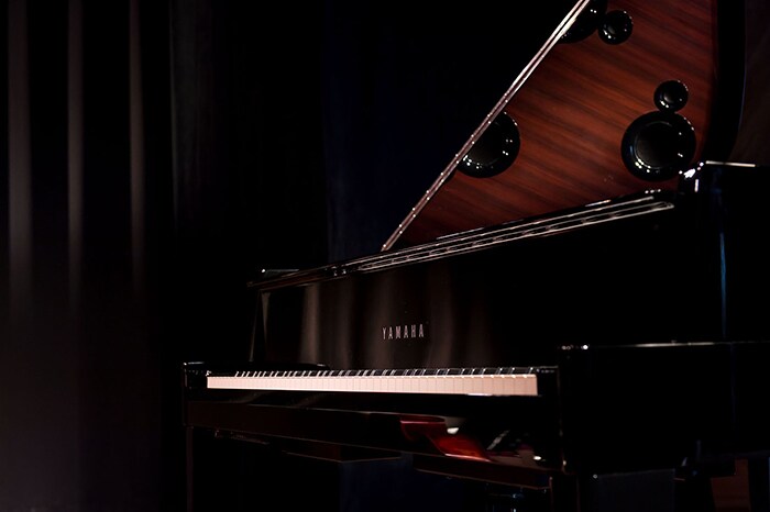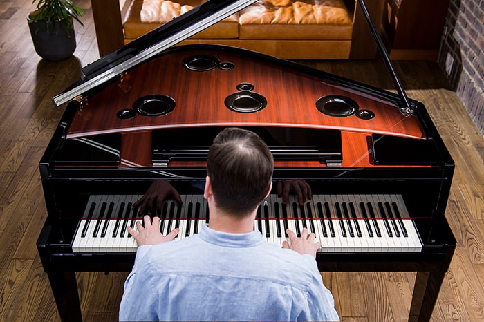 Naast het vierkanaals Spatial Acoustic Speaker System, beschikt de AvantGrand over een vlak zangbodemresonatorpaneel dat zich onder de lessenaar bevindt, over de hele breedte van het instrument. Dit component zorgt voor een subtiele reproductie van de opbouw van het geluid dat u voelt wanneer u op een akoestische vleugel speelt. Het werkt door gebruikmaking van een oscillerende transducer die trillingen overbrengt naar het vlakke paneel op de zangbodem, wat zorgt voor een realistische klankweergave die met name effect heeft in het hogere toetsbereik.