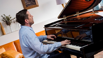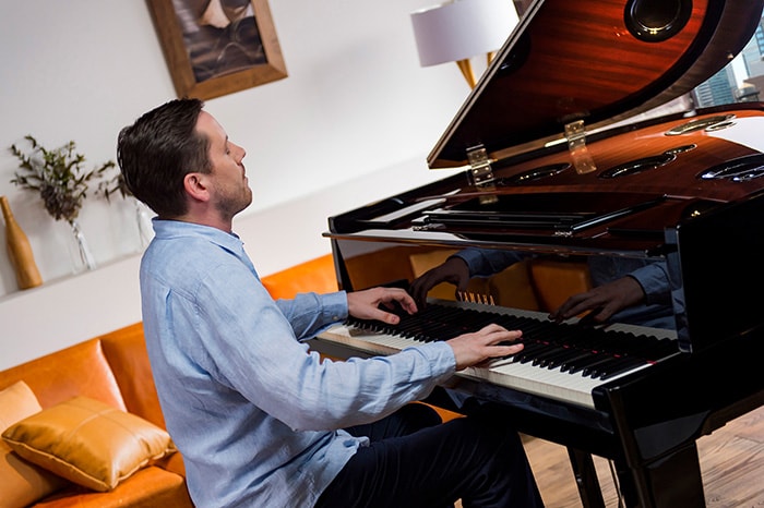 AvantGrand-piano's zijn ontworpen om een onberispelijk kamervullend geluid te leveren. Maar er zijn tijden dat u uw spel voor uzelf wilt houden. Wanneer u bijvoorbeeld 's avonds of 's nachts wilt oefenen of wanneer mensen dichtbij zich met andere activiteiten bezighouden. In dergelijke gevallen biedt een hoofdtelefoon een privéoase waar u de vrijheid hebt om te spelen hoe en wanneer u maar wilt. Dankzij Yamaha’s geavanceerde bi-aurale samplingtechnologie is het geluid dat u via uw hoofdtelefoon hoort, opmerkelijk levensecht. Deze technologie maakt gebruik van pianosamples die zijn opgenomen met speciale microfoons om de positie-informatie en andere nuances die door het menselijk oor onderscheiden worden, te registreren. Het resulterende geluid is zo natuurgetrouw, zo omhullend, dat u zelfs al snel vergeet dat u een hoofdtelefoon op hebt. (Alleen bij de CFX Grand-voice)