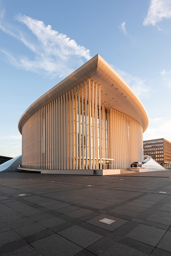 With raked stalls and four seating ‘towers’ on each side, the 1328-capacity Grand Auditorium at Philharmonie Luxembourg combines the acoustics of classic shoe-box concert halls with the atmosphere of a Shakespearean theatre. The smaller Salle de Musique de Chambre features curved walls and can host audiences of 313 people, while the venue’s four foyers can also be used for performances.