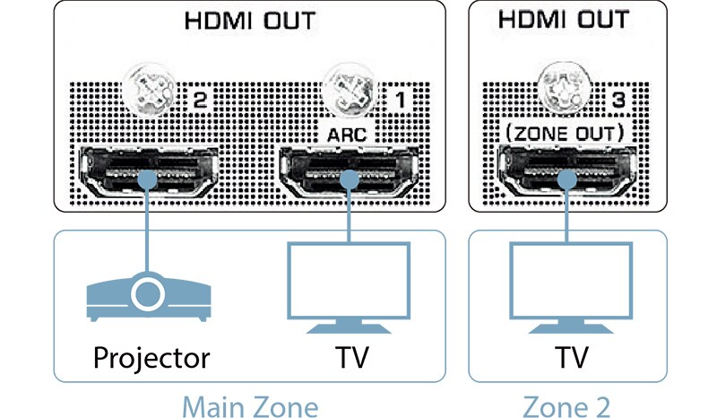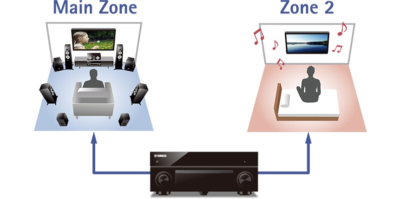 Je kunt je beeld of geluid doorsturen naar een tv of thuisbioscoop in een andere ruimte (Zone 2) via HDMI. Op deze manier kun je in een andere ruimte kijken en luisteren naar dezelfde content als in de eerste ruimte (waar de AV-receiver staat), of naar compleet andere content.