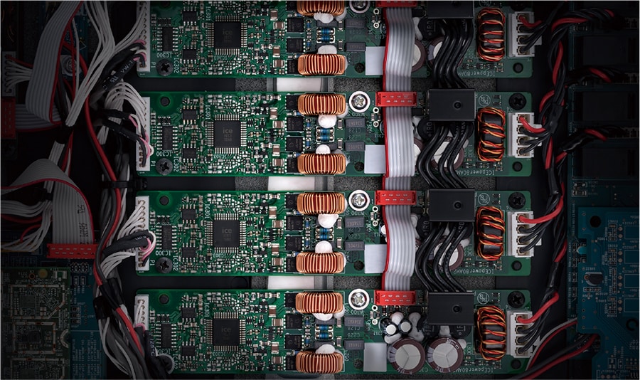 De QS is niet zomaar een versterker. Hij maakt gebruik van superefficiënte ICEpower geïntegreerde circuits en kan daarmee acht kanalen versterken: 50 watt/kanaal (8 ohm) met een geweldige frequentieweergave van 10 Hz tot 22 kHz (+0/-3 dB) en signaal-ruisverhouding van 106 dB. Bij 4 ohm loopt het vermogen op tot 100 watt/kanaal, gebridged is het vermogen 200 watt/kanaal (8 ohm)
