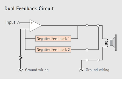The built-in power amplifier delivers stable power output of 130 W with high efficiency while minimizing power consumption and heat production. It does not require an output filter coil, resulting in extremely low noise and distortion. High speed transient response is also excellent. The dual feedback circuit reduces distortion by applying feedback twice, resulting in higher sound clarity.
