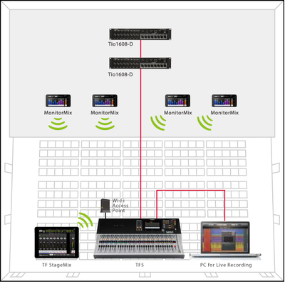 Tio1608-D allows you to easily expand a TF digital mixer system up to 40ch inputs/24ch outputs. System setup uses a Plug In & Play method. Simply connect Cat5e cable, select the device IDs and the system is ready. Remote HA control is available via Cat5e. StageMix and MonitorMix App allows wireless remote control of the console from the arena, the stage or the audience etc.