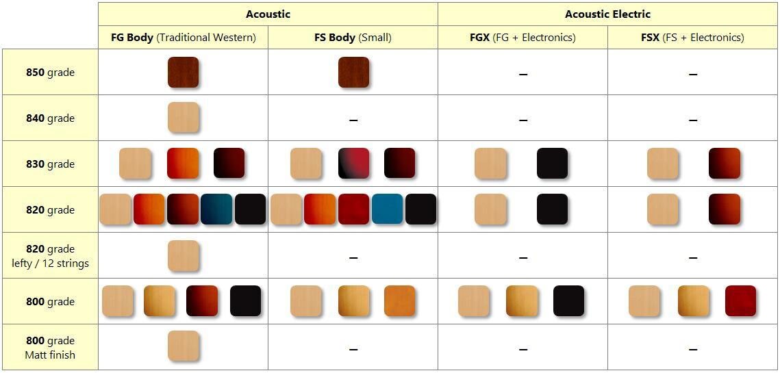 2 klankkastvormen, waaronder een geheel nieuw FS-concertformaat; 5 keuzes met verschillende houtsoorten; een enorm aantal kleuropties; akoestische of elektro-akoestische modellen. Wat de persoonlijkheid van uw muziek ook is, er is een FG die daarbij past.