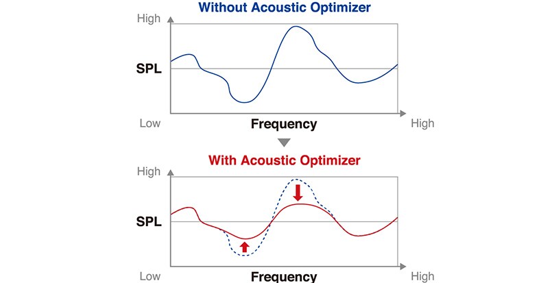 De luidsprekers die aan de behuizing zijn bevestigd, leggen een bijzonder fenomeen aan de dag: als er niets wordt gedaan neemt het volume van het geluid toe ten gevolge van de resonantiefrequentie van het materiaal. Het installeren van Acoustic Optimizers met dezelfde resonantiefrequentie in de kast van de piano, onderdrukt deze resonantie. Deze verbetering van het geluid is iets dat alleen mogelijk is dankzij de diepgaande kennis van Yamaha van de interne akoestische eigenschappen van muziekinstrumenten.