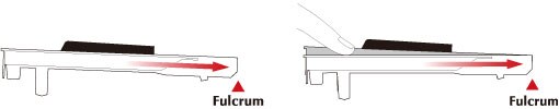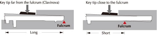 De toetsen op een Clavinova zijn zo geconstrueerd dat het draaipunt zich zo ver mogelijk van de voorkant van de toets bevindt. Dit verbetert de bespeelbaarheid en het comfort, vooral als het nodig is dat u achter op de toets speelt. Deze constructie zorgt voor een goede beweging van de toets, zelfs bij het spelen van stukken die hoofdzakelijk op de zwarte en achteraan op de witte toetsen worden gespeeld, waardoor genuanceerde variaties mogelijk zijn en uw expressieve bereik wordt vergroot.