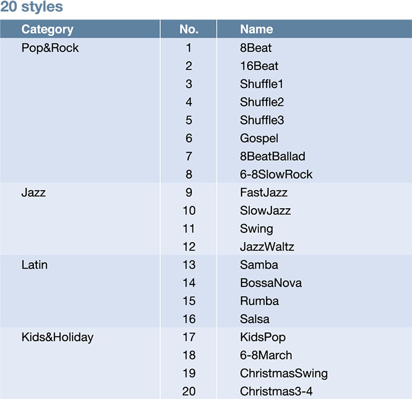 De P-125 heeft ingebouwde bas- en drumtracks waarmee u uw spel in de maat houdt. Er is een verscheidenheid aan ritmepatronen om uit te kiezen, afhankelijk van de vibe waar u voor gaat. Van rock tot ballads, gebruik deze ritmes om een plezierig element toe te voegen aan uw oefenen of gebruik ze gewoon als een virtuele drummer bij uw spel.