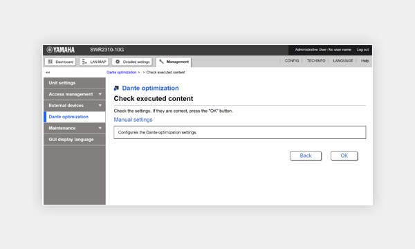 IGMP and QoS settings for SWR series switches can be automatically optimized for Dante network operation by simply clicking the “Dante optimization” button in the web-based GUI. These network settings are not critical in simple systems, but proper configuration is essential to ensure maximum stability in larger Dante networks.