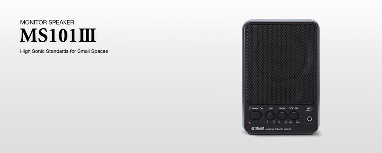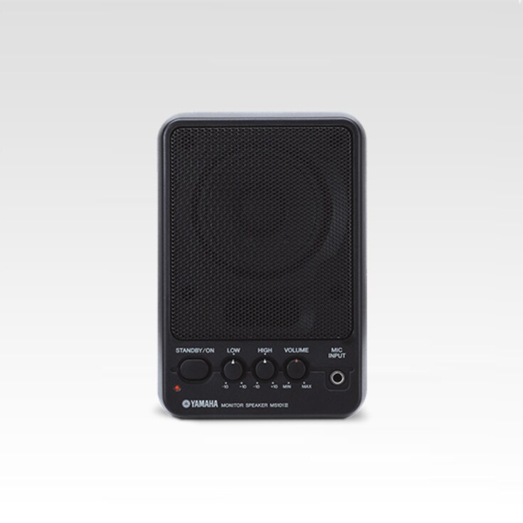 10-cm full-range speaker with 10 watts output. Three inputs: mic × 1 (phone), line × 2 (phone & RCA pin). Tone control (high/low). Line output allows addition of an external speaker. Options for stand or wall mounting (sold separately).